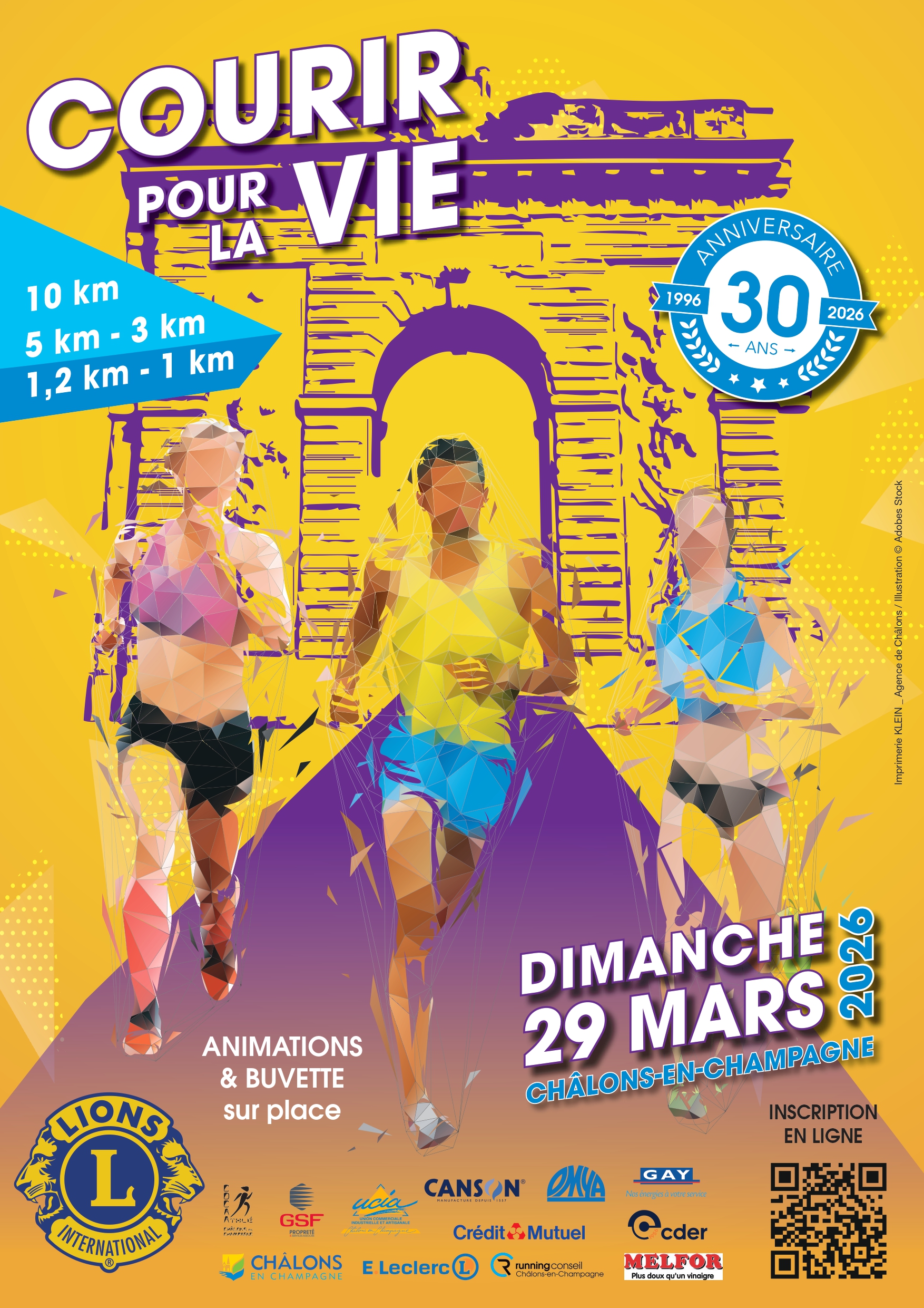 "Courir pour la vie" est une manifestation sportive caritative organis\u00e9e depuis plus de 25 ans par le Lions Club Saint Vincent de Ch\u00e2lons-en-Champagne , avec le soutien technique du Club olympique Champagne Argonne athl\u00e9tisme - COCAA de Ch\u00e2lons-en-Champagne. L'\u00e9dition 2024 se d\u00e9roulera le Dimanche 7 avril avec les courses suivantes: 5 et 10 km Courses classantes et chronom\u00e9tr\u00e9es, Courses jeunes 1.2 km Course r\u00e9serv\u00e9e aux enfants, 1 km Course r\u00e9serv\u00e9e aux enfants et 3 km Course r\u00e9serv\u00e9e aux benjamins et minimes
