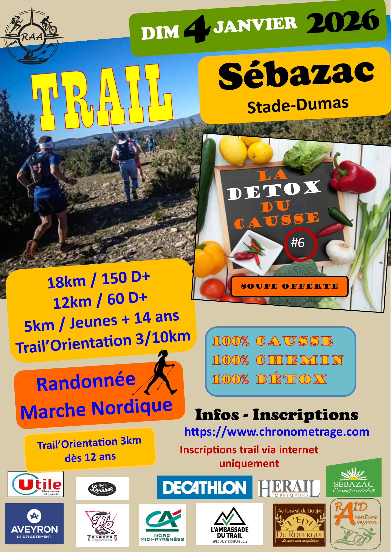La d\u00e9tox du Causse se veut un moment de convivialit\u00e9 apr\u00e8s les f\u00eates, de retrouvailles, de partage mais aussi un moment sportif, avec divers parcours trail (18kms ou 12kms ou 5kms) \u00c3 chacun son rythme (trail, marche nordique, rando), pour \u00e9liminer ou se ressourcer apr\u00e8s les f\u00eates et commencer l\u2019ann\u00e9e du bon pied.